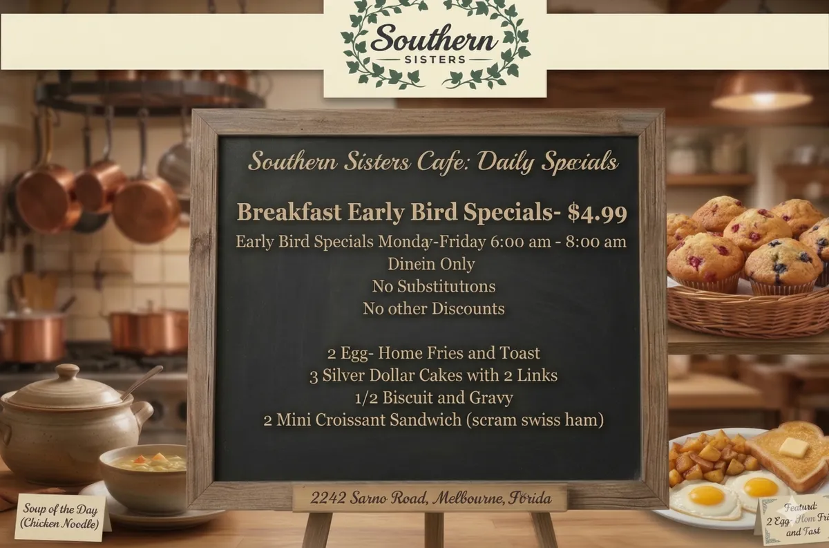© 2026 Southern Sisters Café. All rights reserved. | 2242 Sarno Road, Melbourne, Florida 32935, United States | (321) 475-5779