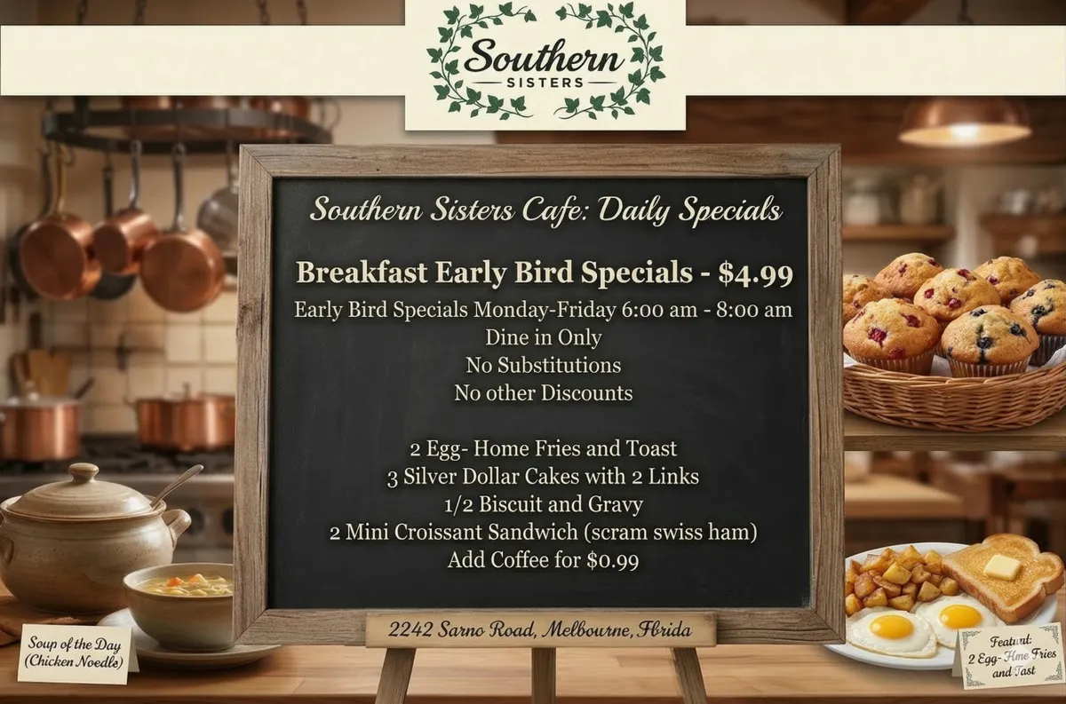 © 2026 Southern Sisters Café. All rights reserved. | 2242 Sarno Road, Melbourne, Florida 32935, United States | (321) 475-5779